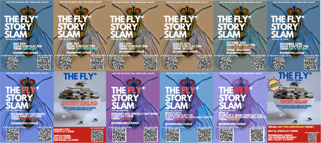 The FLY Story Slam is a storytelling event in Mill Valley hosted by Gary Rudman which is similar to the MOTH where people tell personal stories based on a theme live in front of an audience without notes.